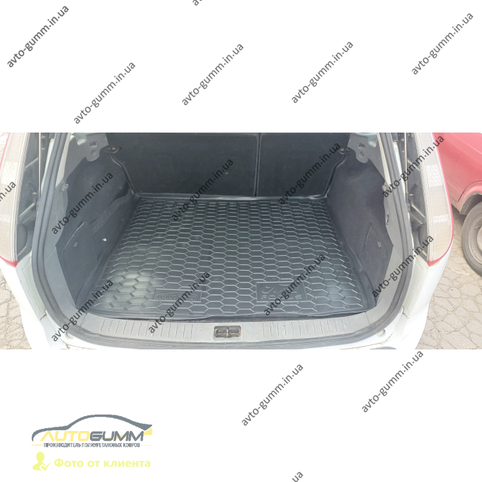 Автомобільний килимок в багажник Ford Focus 2 2004- (Universal) (Avto-Gumm) — гумовий (поліуретановий) килимок у багажник для Форд Фокус 2, чорного кольору. Український виробник AVTO-Gumm виготовляє килимок за лекалом, знятим 3D-сканером безпосередньо з багажника Форд Фокус 2. Килимок 100% повторює геометрію багажника — всі вигини, виступи та арки коліс.